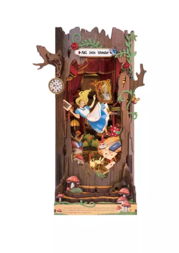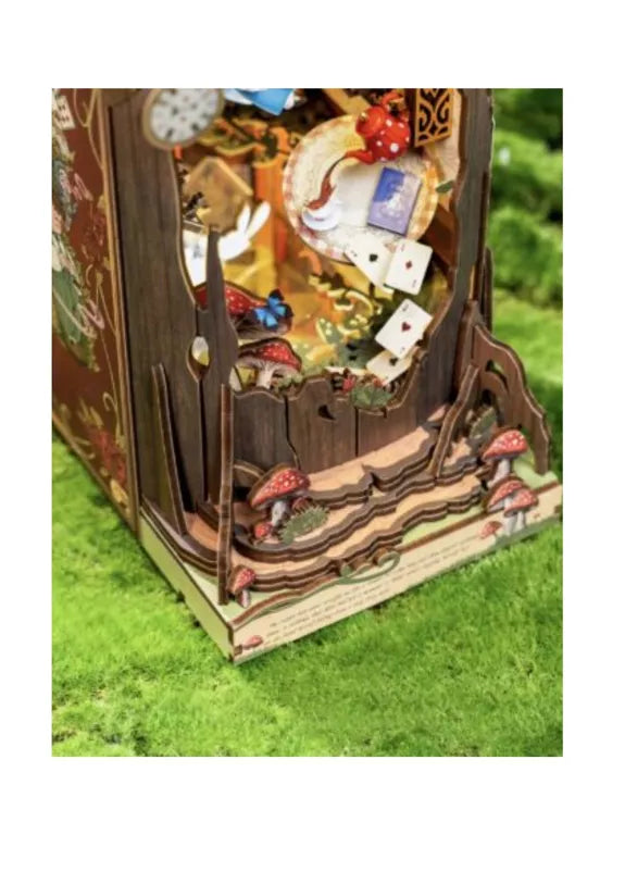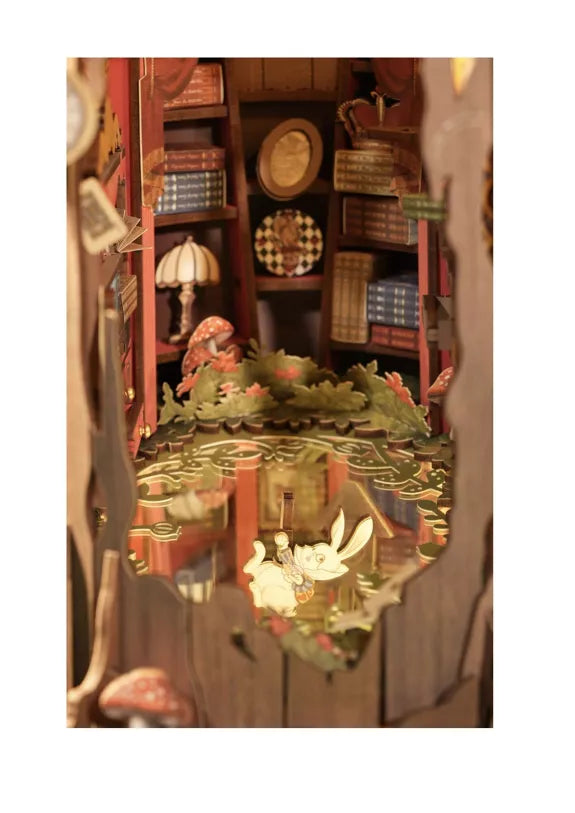 Laissez votre imagination vous guider vers un espace créatif de détente et de concentration avec l'étonnant Book Nook Alice au pays des Merveilles. La façade de l'ensemble a la forme d'un gros tronc d'arbre dont la base est formée de marches en forme de souche. Tout en haut, une ouverture en forme de trou de serrure révèle les mystères qui se cachent à l'intérieur. À l'intérieur, des plaques décoratives, des cadres photo et des surprises cachées comme le miroir infini attendent d'être découverts dans ce qui semble être un étang intérieur ! On y trouve des champignons originaux, de vieux livres, des jeux de société et la citation profonde « L’imagination est l’arme dans la guerre contre la réalité ». Soyez fou et curieux avec ce coin livre unique !