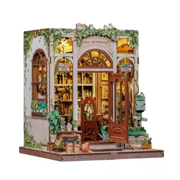 Ajoutez une touche littéraire et végétale à votre intérieur : assemblez, décorez et illuminez votre librairie miniature.